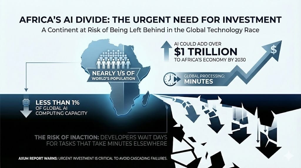 Africa is home to nearly one-fifth of the world's population, yet it holds less than 1% of global AI computing capacity. A new report from advisory firm Axum warns the continent could be left behind in the global technology race without urgent investment. AI could add more than $1 trillion to Africa's economy by 2030, Axum said, but African developers must wait days to process tasks that take minutes elsewhere.