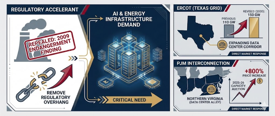 On February 12, the EPA finalized its repeal of the 2009 Endangerment Finding, the scientific and legal determination that greenhouse gas emissions endanger public health and welfare. Administrator Lee Zeldin called it “the single largest deregulatory action in U.S. history.” The repeal eliminates the legal basis for federal regulation of greenhouse gases from vehicles, power plants, oil and gas operations, and industrial facilities. For the AI and energy infrastructure story, this is a direct accelerant, removing the federal regulatory overhang on gas-fired generation at precisely the moment data center operators need it most. The Electric Reliability Council of Texas (ERCOT), which manages the grid serving most of Texas and its rapidly expanding data center corridor, has revised its 2030 capacity needs from 110 GW to 150 GW in a single announcement. PJM Interconnection, the regional transmission organization coordinating the power grid across 13 states from Illinois to New Jersey and home to the densest concentration of data centers in the world (Northern Virginia’s “Data Center Alley”), saw its capacity auction prices for 2025-26 increase over 800% from the year before.