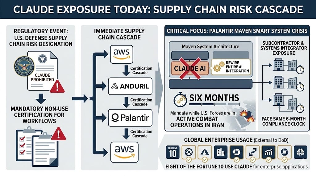 For companies with existing Pentagon exposure, the compliance clock is immediate. The supply chain risk designation forces every defense contractor to certify it does not use Claude in its workflows. Palantir built its Maven Smart System on Claude and must now rewire its entire AI integration on a six-month timeline while U.S. forces are engaged in active combat operations against Iran. Eight of the Fortune 10 use Claude for enterprise applications. Audit your Claude exposure today and model the brand risk of compliance across all your business segments, not just the defense vertical.