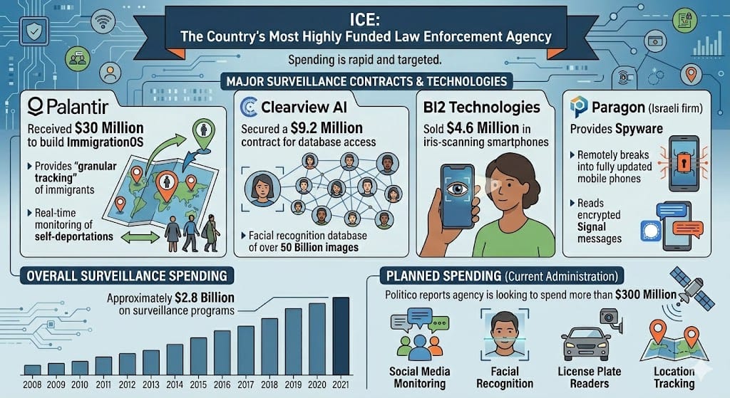 Last summer, Congress transformed ICE into the country’s most highly funded law enforcement agency. The One Big Beautiful Bill Act, signed July 4, 2025, added $75 billion over four years to ICE’s approximately $10 billion base budget, tripling the agency’s effective annual spending to nearly $30 billion. That is more than Poland’s entire military budget. The agency’s subsequent spending on surveillance technology has been rapid and targeted. Palantir received $30 million to build ImmigrationOS, a platform that provides “granular tracking” of immigrants including real-time monitoring of self-deportations. Clearview AI secured a $9.2 million contract for access to a facial recognition database of over 50 billion images. BI2 Technologies sold $4.6 million in iris-scanning smartphones. Paragon, an Israeli firm, provides spyware capable of remotely breaking into fully updated mobile phones and reading encrypted Signal messages. Politico reports the agency is looking to spend more than $300 million specifically on social media monitoring, facial recognition, license plate readers, and location tracking.